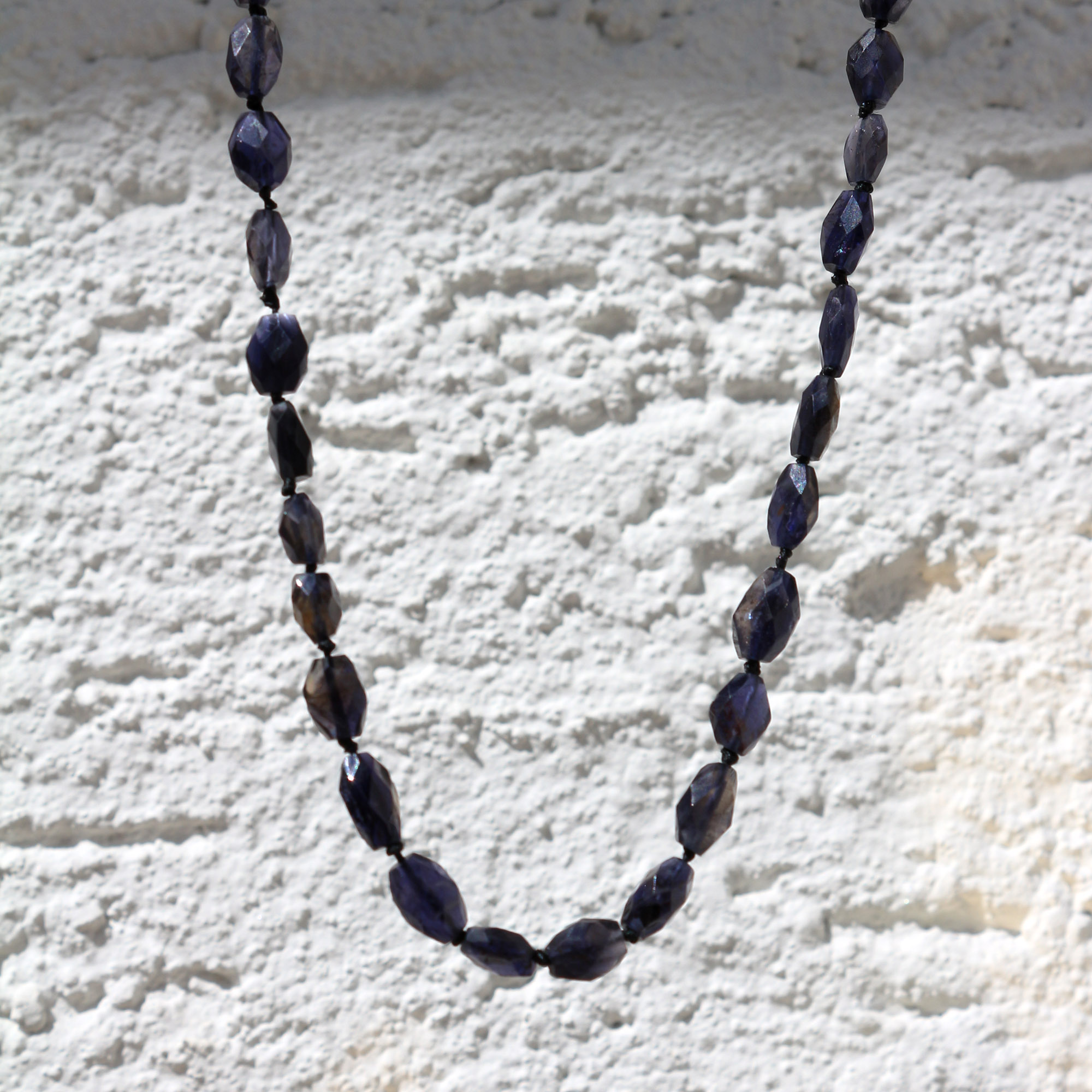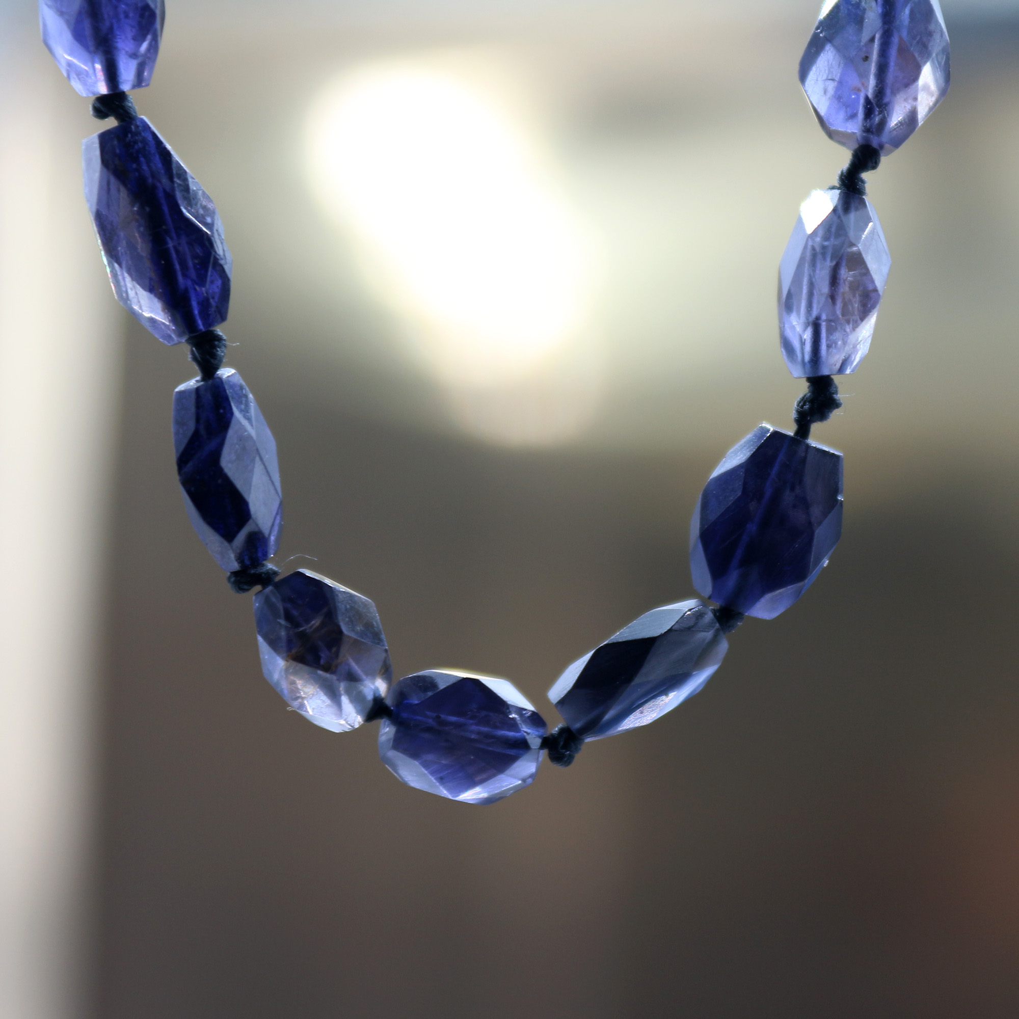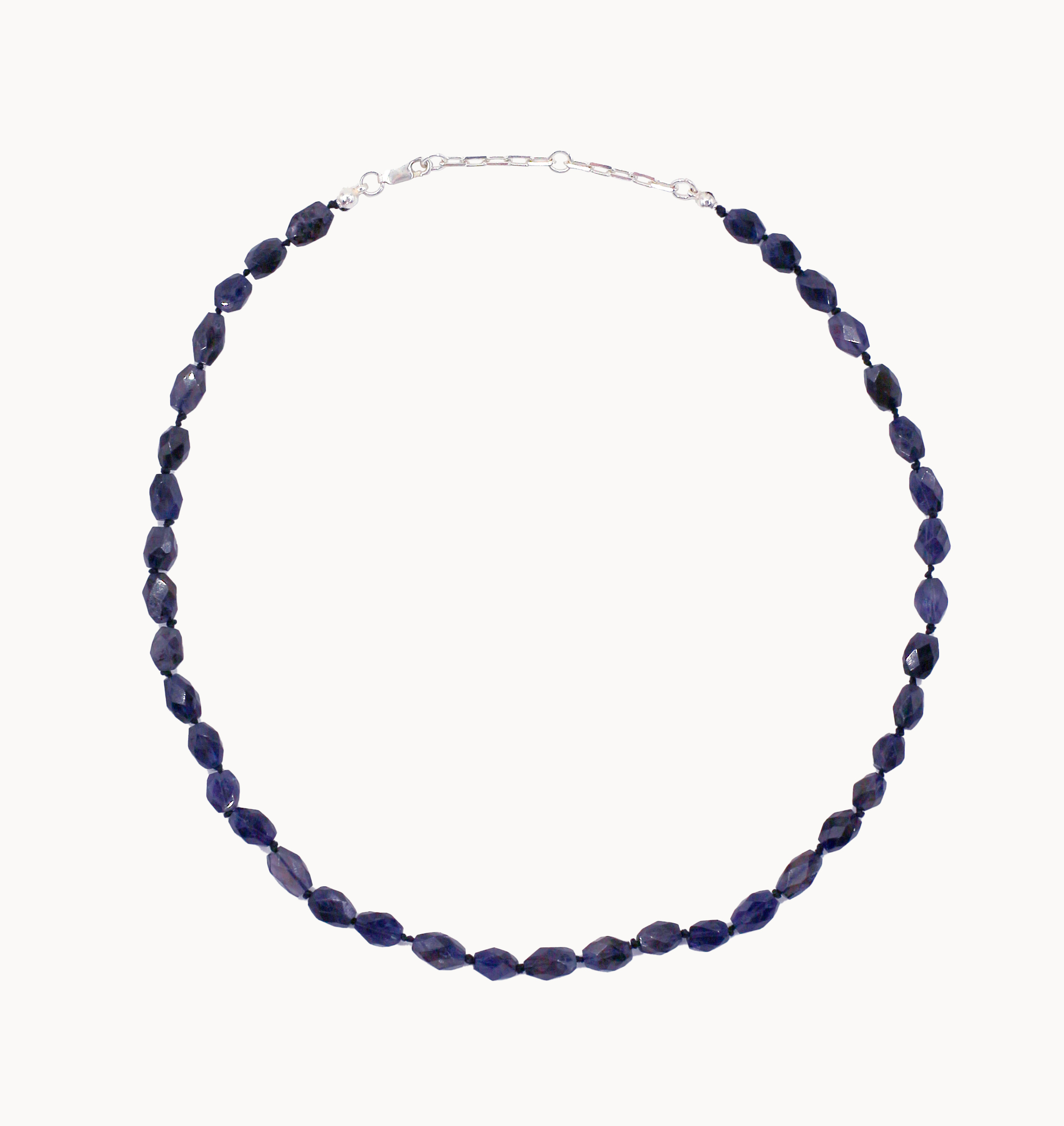 İyolit taşı gümüş kolye. Özel kesim iyolit taşından hazırlanan kolye ipek iplikle düğümlenmiştir. %100 el yapımıdır. Kapama ve uzatma malzemeleri 925k gümüştür.