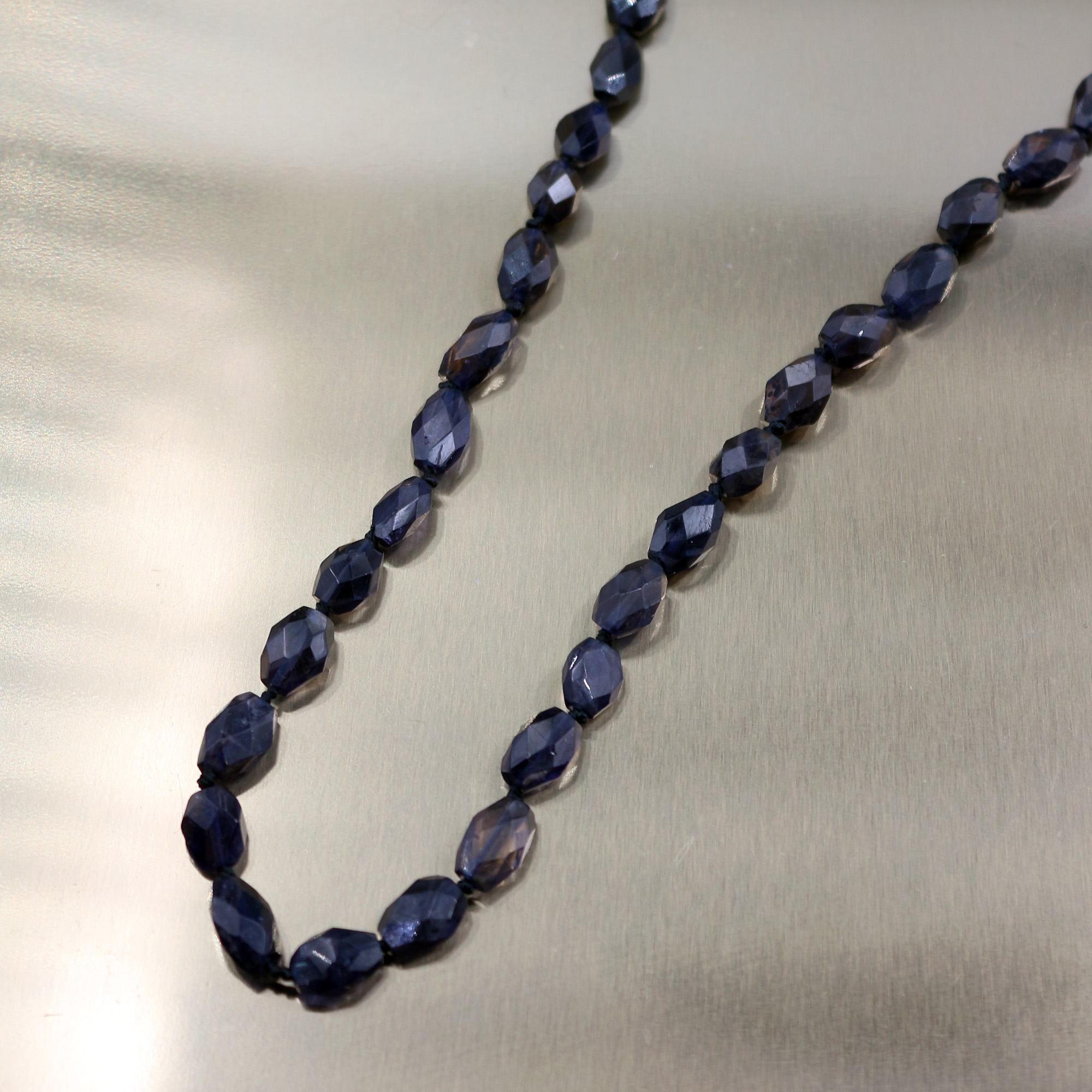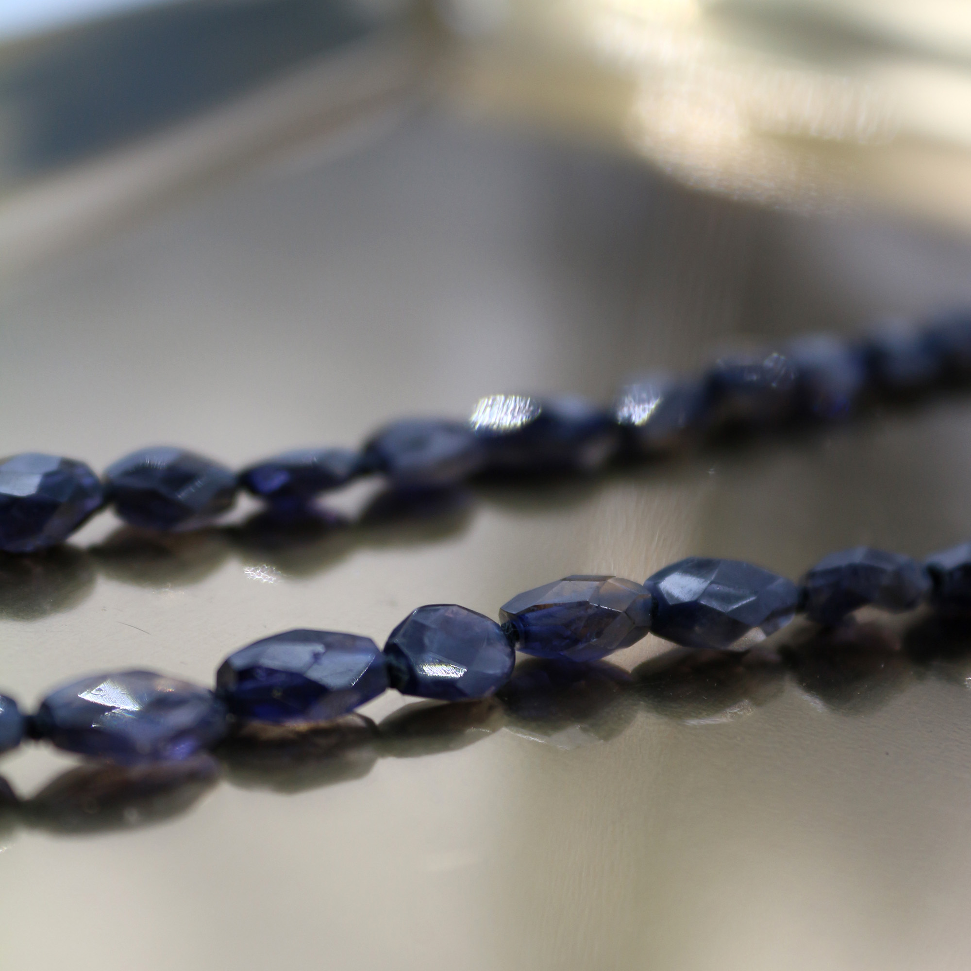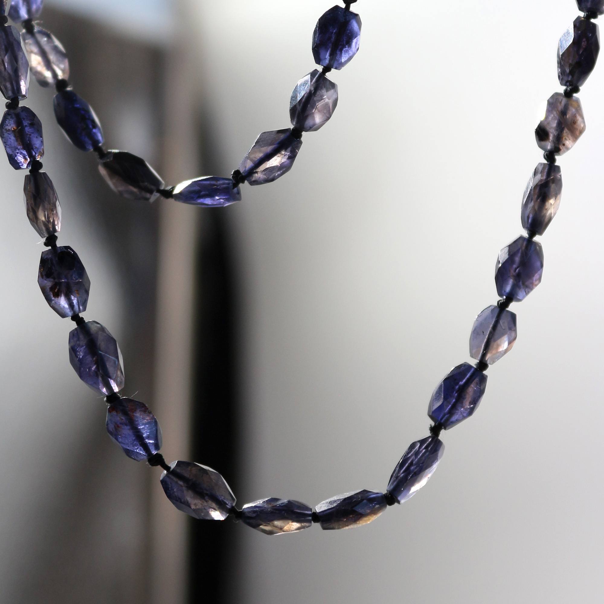 İyolit taşı gümüş kolye. Özel kesim iyolit taşından hazırlanan kolye ipek iplikle düğümlenmiştir. %100 el yapımıdır. Kapama ve uzatma malzemeleri 925k gümüştür.